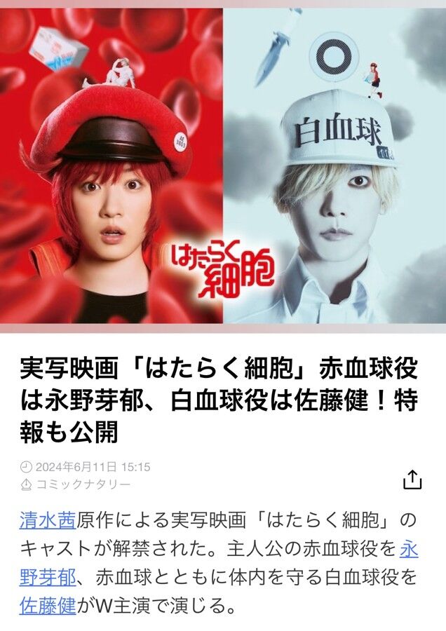 @maruzen_maruhon【3Fフェア】赤血球役に #永野芽郁 さん&白血球役に #佐藤健 さんのW主演の「#はたらく細胞」実写映画が12/13より公開されます。ビジュアルすごすぎ。公開を記念して、原作コミック、ノベライズ、児童書をまとめて揃えております。 pic.x.com/vuJgfEbPKn